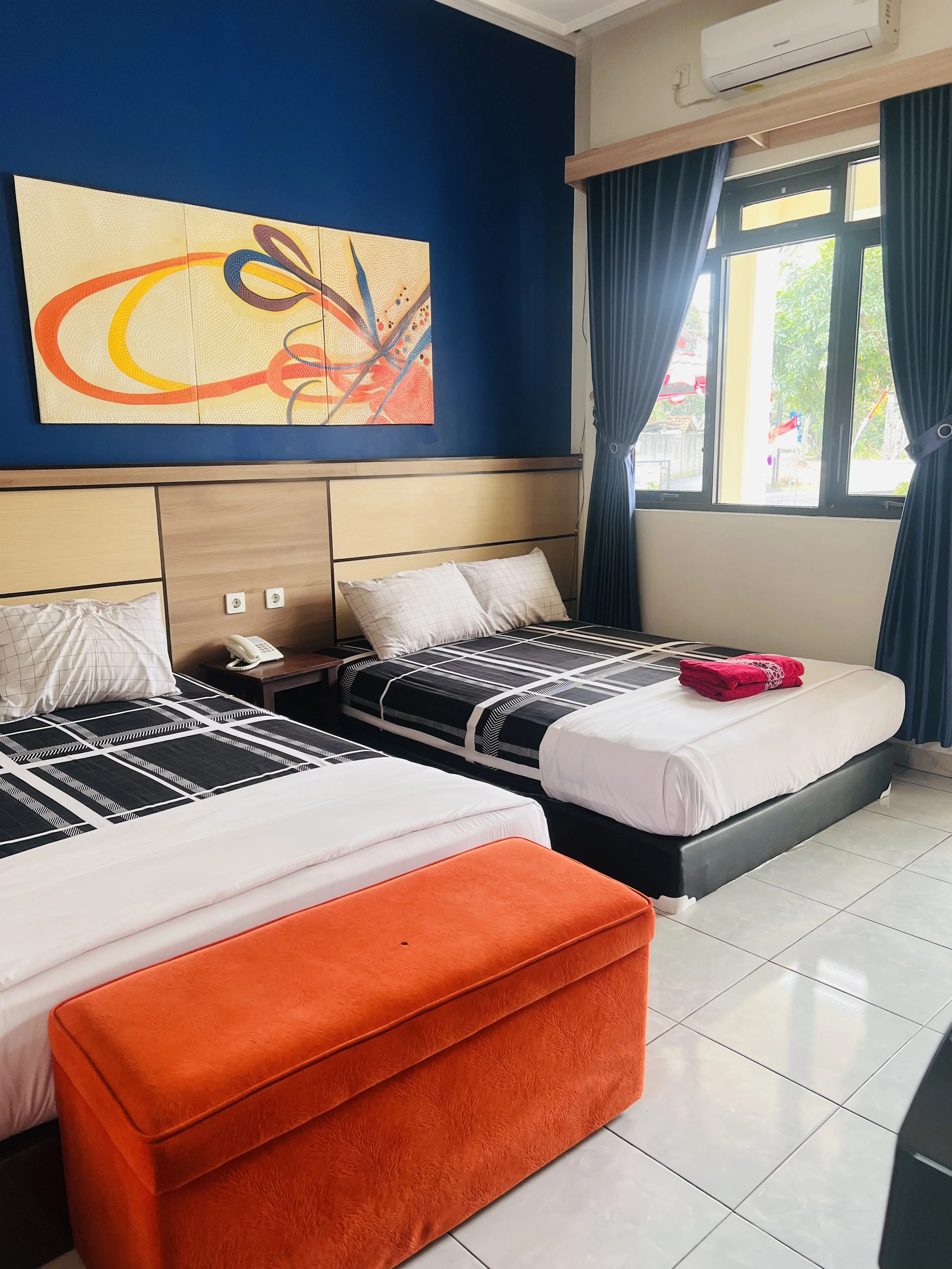 Cocok untuk keluarga kecil, 2 king beds, wifi, AC, 4 dewasa. Free breakfast, parkir luas & teras tiap kamar, no smoking room